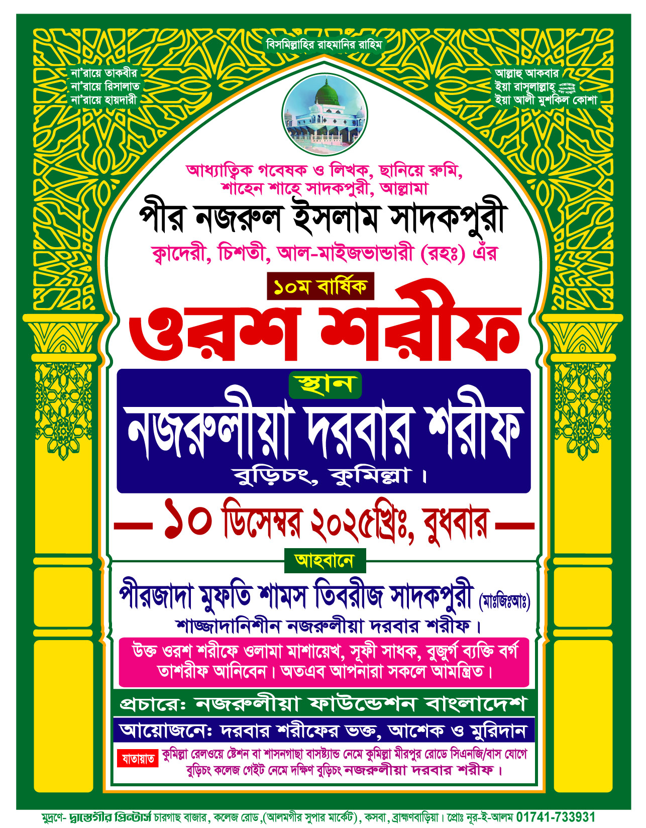 মহররম হোসেনঃ আধ্যাত্বিক লেখক ও গবেষক ছানীয়ে রুমী আল্লামা পীর নজরুল ইসলাম সাধকপুরী আল্ কাদেরী আল-মাইজভান্ডারী রহঃ এর মহা পবিত্র ওরছ মোবারক উপলক্ষে ভক্ত আশেকানদের মধ্যে চলছে ব্যপক প্রস্তুতি ও উৎসাহ উদ্দিপনা। ১০ ই ডিসেম্বর ২০২৫ইং বুধবার বাবা নজরুল শাহ্ রহঃ এর ১০ তম বার্ষিক ওরশ মোবারক উপলক্ষে ইতিমধ্যেই পোস্টর ও ফেস্টুন ছাপার কাজ সম্পন্ন হয়েছে। খুব শীঘ্রই নজরুলীয়া ফাউন্ডেশন বাংলাদেশ কর্তৃক সারাদেশ ব্যাপী প্রচার প্রচারনা শুরু হবে। এ ব্যাপারে নজরুলীয়া ফাউন্ডেশন এর প্রতিষ্ঠাতা চেয়ারম্যান পীরজাদা মুফতি শামস্ তিবরীজ সাধকপুরী (মাঃজিঃআঃ) বলেন সারা বিশ্বব্যাপী বাবাজান কেবলার গানের ভক্ত আশেকান ছড়িয়ে ছিটিয়ে আছেন, তিনি তার লিখনী, গায়কী ও জজবা হালের মাধ্যমে তরিকত তাসাউফ প্রেমিক আশেকানদের অন্তরে অমর আসন অর্জন করেছেন। এতোদিন আমরা ভক্ত আশেকানদের প্রত্যাশা অনুযায়ী প্রচার প্রসার করতে পারিনি, পৌছাতে পারিনি দাওয়াত পত্র সকলের দোরগোড়ায়। এই বছর পবিত্র ওরছ শরীফের দশ বছর পূর্তি উপলক্ষে ভক্ত আশেকানদের মধ্যে ব্যাপক উৎসাহ উদ্দিপনা দেখছি এবং সেই ভাবেই প্রচার পরিকল্পনা হাতে নিয়েছি। নজরুলীয়া ফাউন্ডেশন বাংলাদেশ এর মাধ্যমে সারাদেশ ব্যাপী ভক্ত আশেকানদের মাঝে দাওয়াত পত্র পৌছে দেবো ইনশাআল্লাহ! এছাড়া আপনাদের মিডিয়ার মাধ্যমে সকল দর্শক স্রোতা ও পাঠকদের সবিনয় দাওয়াত করছি নজরুল বাবার তরিকত তাসাউফ প্রেমের মেলায় আসুন, ওলী আওলিয়ার মহব্বতে ও ভালোবাসায় তাপিত প্রান শীতল হবে ইনশাআল্লাহ!