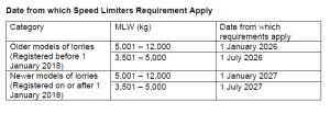 ৩,৫০০ কেজি থেকে ১২,০০০ কেজির মধ্যে সর্বাধিক বোঝাই ওজনের লরিগুলিকে অবশ্যই গতি সীমাবদ্ধকারী যন্ত্র স্থাপন করতে হবে যা নিশ্চিত করে যে যানবাহনগুলি ৬০ কিলোমিটারের বেশি গতিতে চালানো যাবে না।